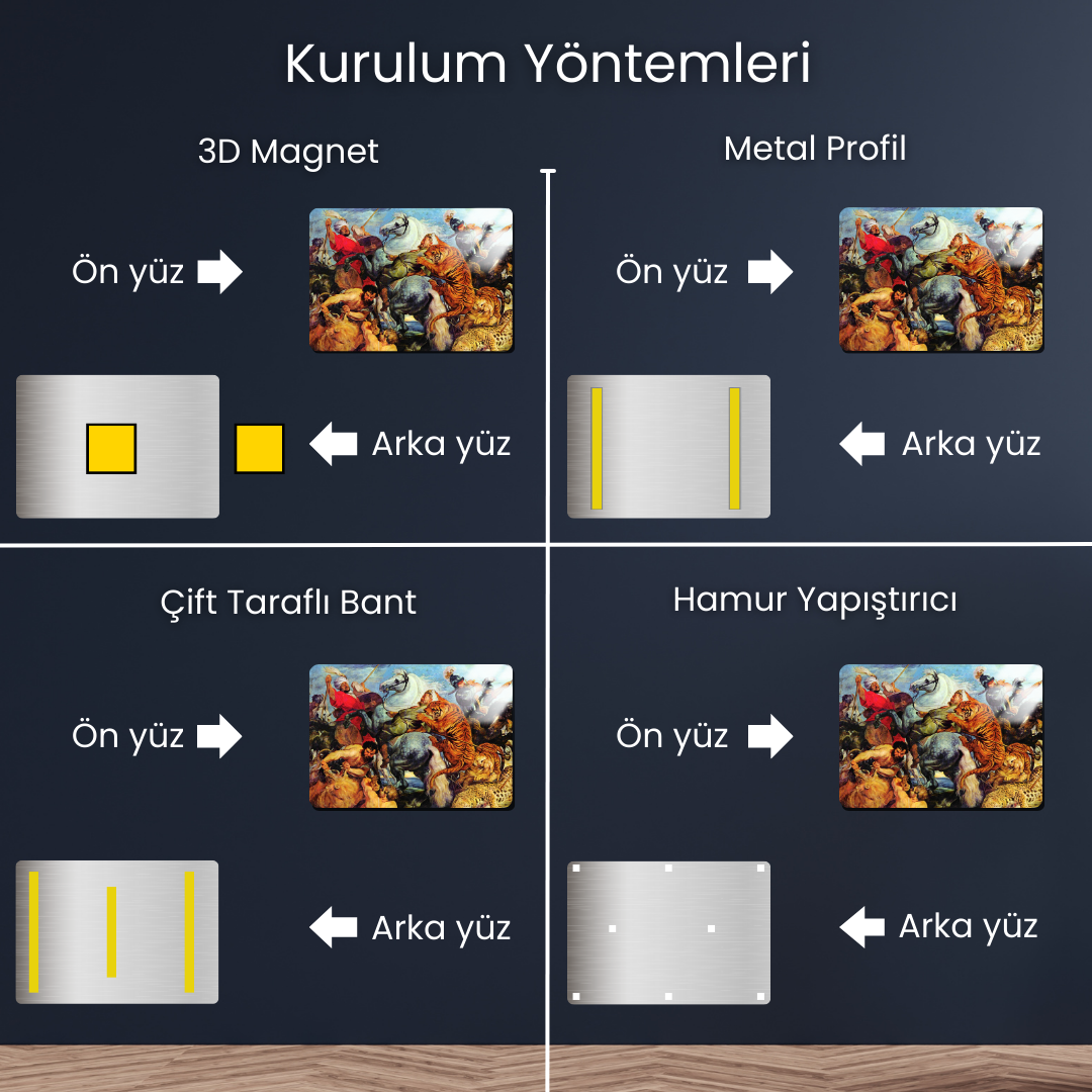 Cavron art metal posterler 0.45-0.50 mm kalınlığında olup hafifliğinden dolayı taşıma problemi oluşturmaz. Yapmanız gereken tek şey ürünle birlikte gelen çift taraflı bantlarıyla dilediğiniz şekilde yapıştırarak kolayca sabitlemektir. Dilerseniz de mıknatıs seçeneğiyle posterlerinizi yüzeye 2 cm (yaklaşık) dışarıda kalacak şekilde sabitleyerek ortama fütüristik bir görüntü katabilirsiniz. Üçüncü bir alternatif olarak hamur yapıştırıcı seçeneğimiz de mevcuttur.